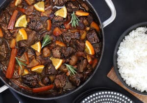 - מוציאים, מקשטים בעלי רוזמרין טריים ופרוסות תפוז טריות ומגישים למרכז השולחן (בתוך כלי הבישול) לצד אורז לבן