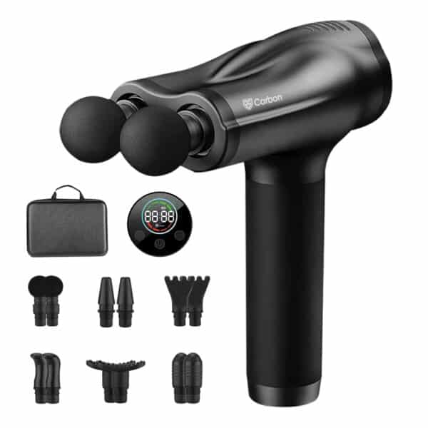 אקדח עיסוי דו-ראשי מקצועי עם 12 ראשי עיסוי מתחלפים וסוללה נטענת, עוצמה כפולה CARBON קרבון דגם PROLAX