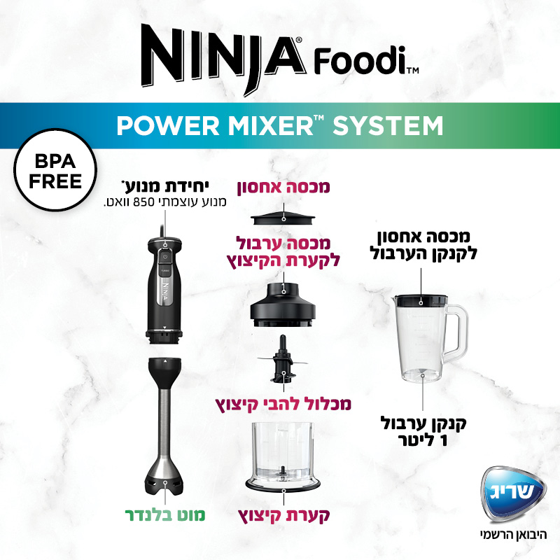 • בעל להבי נינג’ה חדים ומדויקים להכנת מחיות, מרקים חלקים, מטבלים, משקאות קפואים ועוד. לערבל ולקצוץ ישר בתוך הסיר או בקנקן הערבול הייעודי.