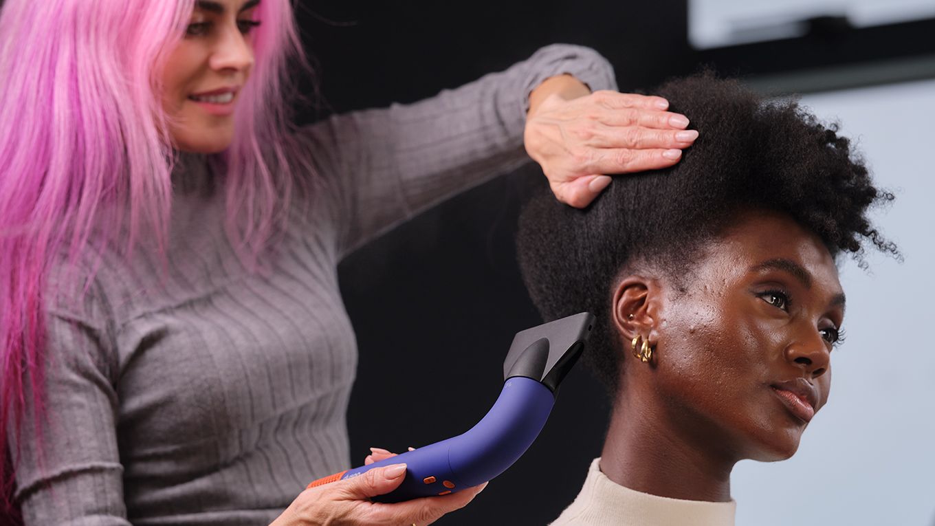 Global Styling Ambassador מייבשת שיער של דוגמניות עם מייבש השיער Dyson Supersonic r Professional עם אביזר חכם.