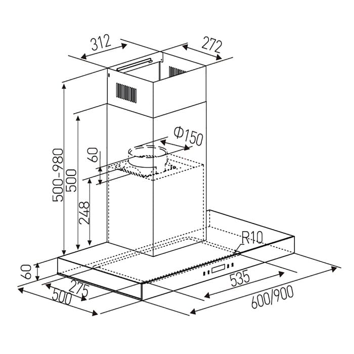 קולט אדים 90 ס”מ LY Vent ליוונט LV-F-515 נירוסטה פנל זכוכית שחורה