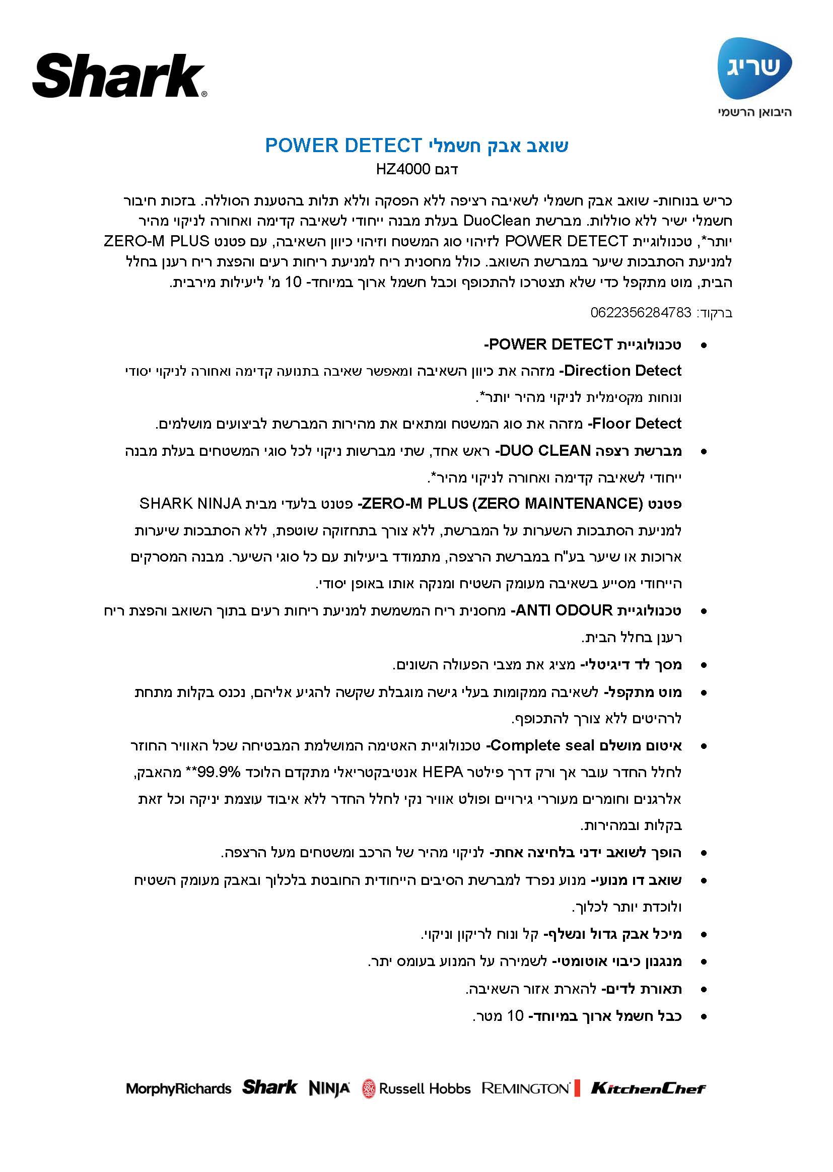 שואב אבק חשמלי POWER DETECT שארק SHARK דגם – HZ4000