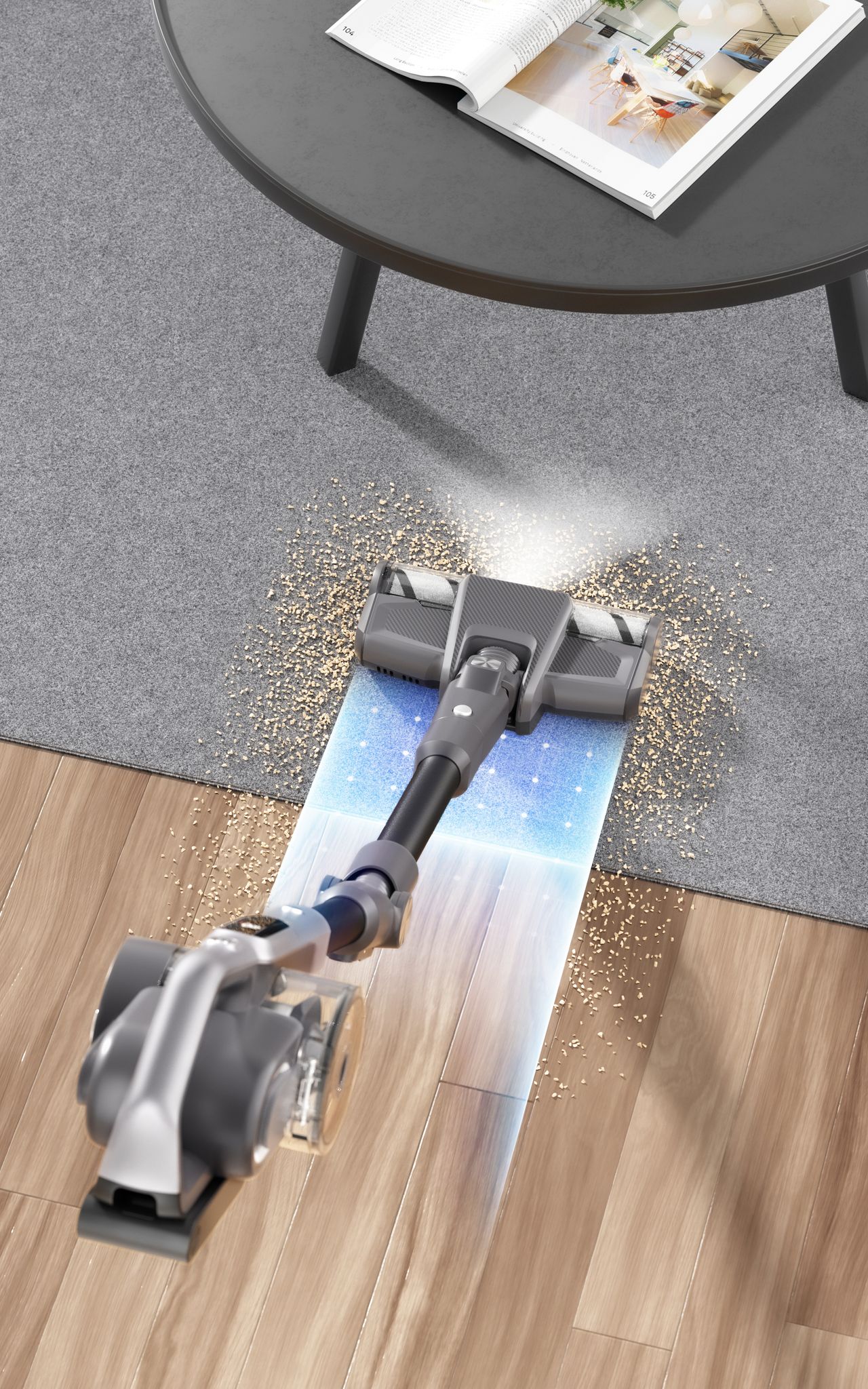 כאשר פס תאורת ה-LED הצבעוני הופך לאדום – השואב מסמן שהמשטח מלוכלך מאוד, וכשהוא הופך לכחול – המשטח נקי.
