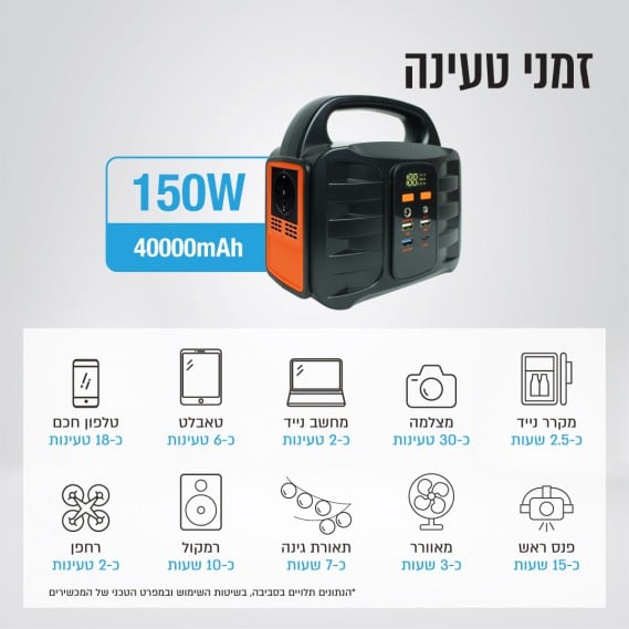 סוללה חזקה – קיבולת של 40,000 מיליאמפר להטענה / הפעלה מגוון רחב של מוצרי חשמל עד150W
