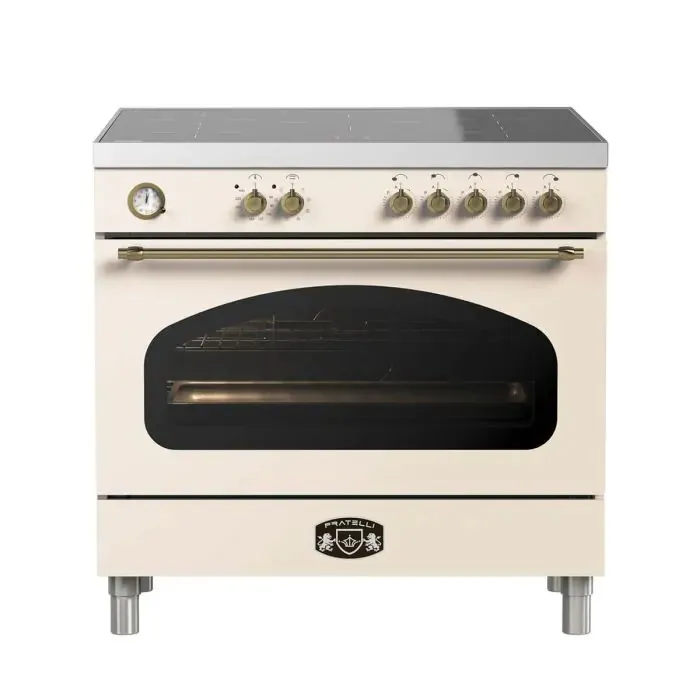 תנור משולב אינדוקציה 90 ס״מ מבית Fratelli – סדרת Venice בעיצוב קרם-ברונזה יוקרתי, עם כיריים אינדוקציה חזקות ותנור אפייה איכותי לאפייה מושלמת בכל יום.